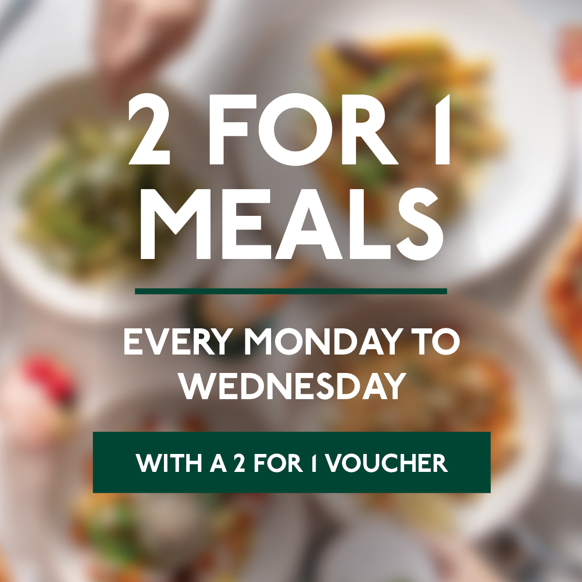 Eating out made easy with our 2 for 1 meals from Monday to Wednesday. Just purchase any main meal from Thursday to Sunday to receive your voucher.